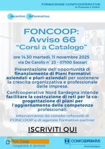 Confcooperative Nord Sardegna ha organizzato un incontro informativo in collaborazione con FONCOOP e agenzie formative partner per presentare l’Avviso n. 66 “Corsi a Catalogo”, una misura che sostiene la crescita e l’aggiornamento professionale dei lavoratori attraverso piani formativi aziendali e pluri-aziendali.