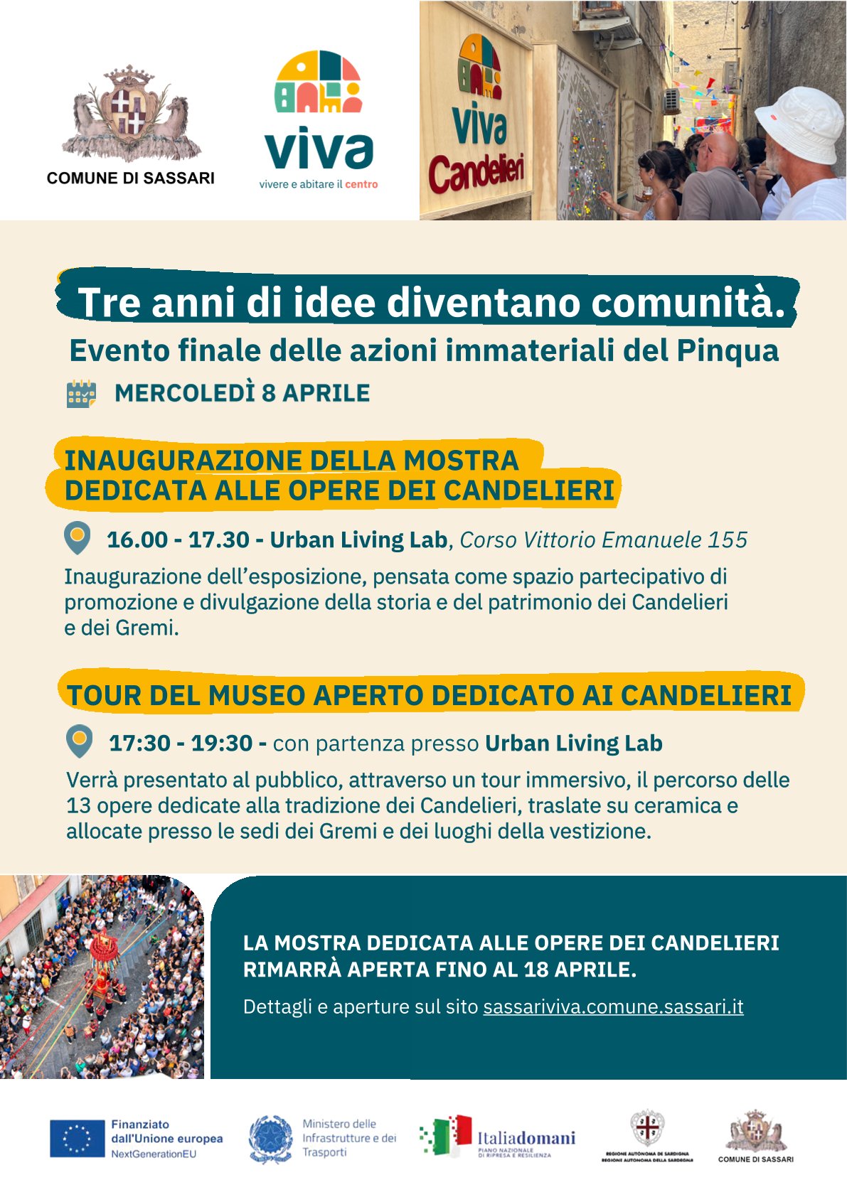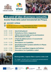 Si inizia l’8 aprile con un pomeriggio dedicato all’arte e al patrimonio culturale di Sassari e si prosegue poi il 9 aprile con un momento pubblico aperto alla cittadinanza, ad associazioni, cooperative, operatori economici, istituzioni e a tutti i soggetti coinvolti, per raccontare tre anni di lavoro condiviso e partecipato che hanno contribuito alla rigenerazione del centro storico di Sassari.